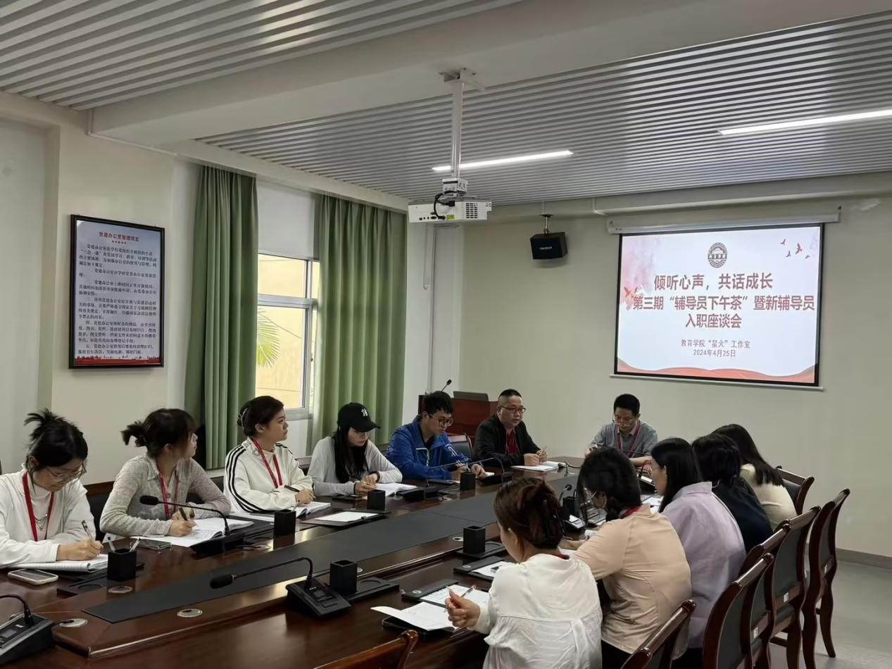 为进一步加强广大辅导员工作能力与职业素养,倾听辅导员的心声,解决辅导员工作中遇到的难点,充分提高辅导员工作的幸福感、获得感,不断提升辅导员职业认同感,5月18日下午,我校教育学院“星火”辅导员工作室组织召开了第三期“辅导员下午茶”暨新辅导员入职座谈会,学院院长王纳共出席会议并讲话,全体新入职辅导员及部分老辅导员代表参加会议。院党总支书记杨志桥主持会议。
